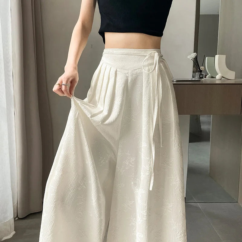 Sa taille haute et sa ceinture à nouer permettent un ajustement optimal, tandis que ses plis délicats ajoutent du volume et de la fluidité à la silhouette.